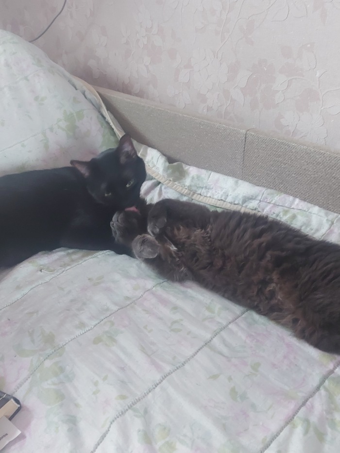 Тем неожиданнее было прийти домой из магазина, зайти на кухню и обнаружить там маму, которая сидела на полу, обнимая черный комок. Оказалось, сестра нашла под подъездом и не смогла оставить. Меня отправили обратно в магазин - за кормом и лотком, а потом и в ветаптеку за глистогонным. Бабушка неделю потом ни с кем из семьи не разговаривала, мне рассказала, что плакала, а через неделю пришла к маме с фразой: «ну что вы его в одной комнате закрываете, хватит его прятать, пусть бегает». Через месяц, кстати, в предверии нового года, она купила ему новый лоток, чтобы ему удобно было и до сих пор покупает влажный корм в качестве угощения. Сейчас он, очевидно, ее любимец (да и она его любимица, что уж там). Как не зайду в комнату – лежат вдвоем на диване, телевизор смотрят вместе)