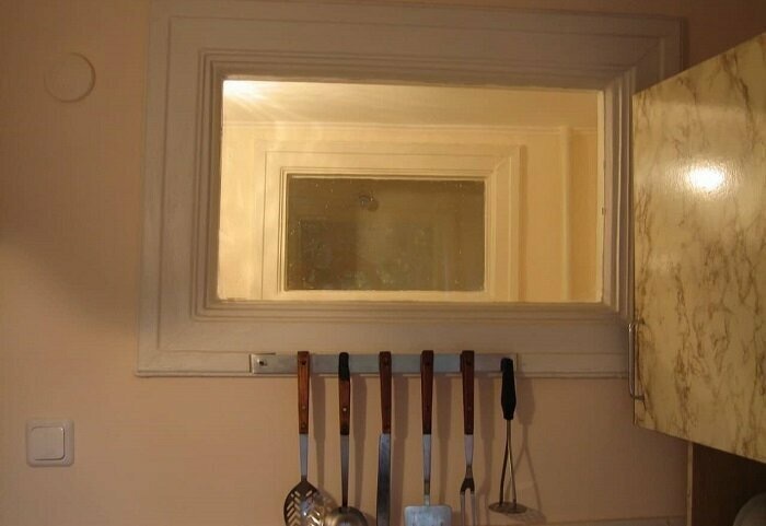 Следующая версия более логичная, хоть и не такая популярная. Санузлы всегда имели «глухие» стены, что негативно сказывалось на освещенности. Небольшое окошко в кухню эффективно пропускает естественное освещение. В ясный день света хватает настолько, чтобы не использовать искусственное освещение. Якобы ноу-хау помогало экономить электричество. Вечером же яркая лампа на кухне справлялась с освещением двух маленьких помещений. Конечно, при таком освещении никто не брился. Но для других задач света хватало.