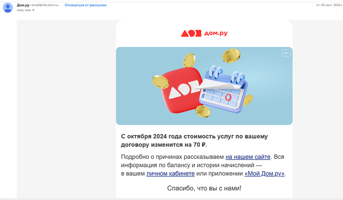 Было много постов, как операторы то цены на 100р поднимали, то еще что то в тарифах и услугах меняли. Дом.ру и его Цифрал сервис с домофонами переплюнул, даже ОПУСТИЛ ВСЕХ и сотовых и провайдеров, подняв цену в моем регионе с 58р/ мес до 166р/ месяц за домофон. ОКАЗЫВАЕТСЯ ОНИ ТРИ ГОДА В ТЕСТОВОМ РЕЖИМЕ УСЛУГИ ПРЕДОСТАВЛЯЛИ! НЕ БУДЕШЬ ПЛАТИТЬ-ХЕР В ДОМ ВОЙДЕШЬ, ВСЁ ОТКЛЮЧИМ. Причем счет выставляют на предоплату 3 месяца и 1 год!