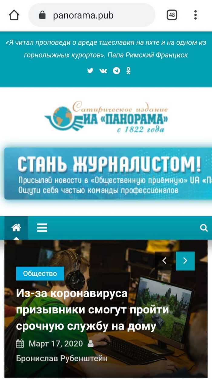 Говоря про использование фейков, нельзя не вспомнить про информационное агентство «Панорама». На сайте прямо сказано, что это сатирическое издание, и все материалы в нем — это сатирические фельетоны. «Панорама» существует за счет донатов (кстати, зайдите в раздел «Поддержать» и полистайте комментарии, которыми сопровождают свои пожертвования читатели, занимательное чтение).