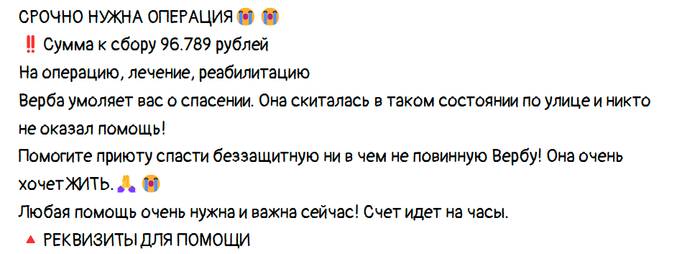Если вы не знаете, то поясню: сборы на лечение собачек-кошечек идут лучше, если периодически давить на жалость фотками несчастных животных, и писать фразы типа "неужели вы пожалеете сто рублей на лечение?", "вместо кофе вы можете купить собаке день жизни", "тот, кто пройдёт мимо - не имеет сердца" и т.д.