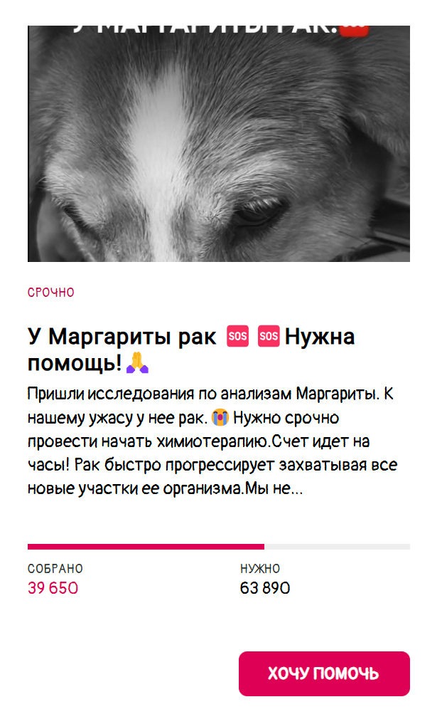 И таких там море. Где-то счёт на минуты, где-то счёт на часы. После закрытия срочносбора хер ты найдёшь где собаку, как пример https://pomogi-zhit.ru/campaign/fione-srochno-nuzhna-nasha-p...