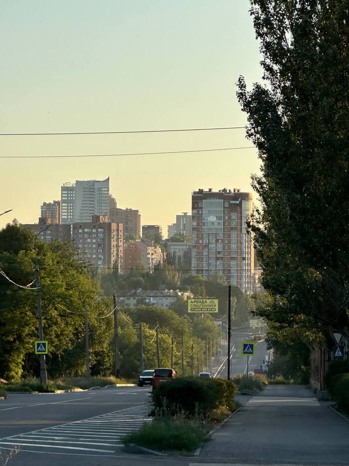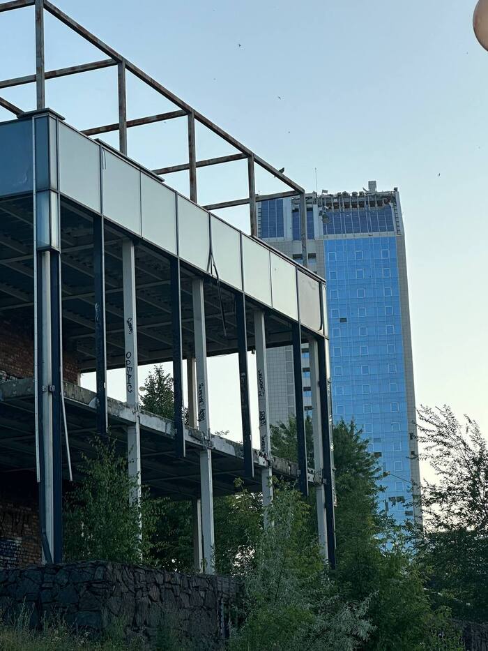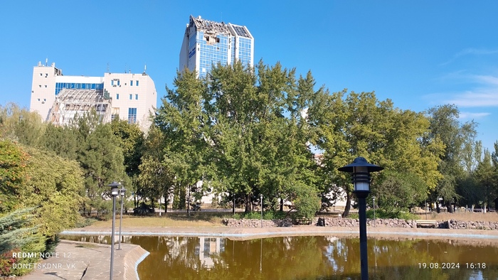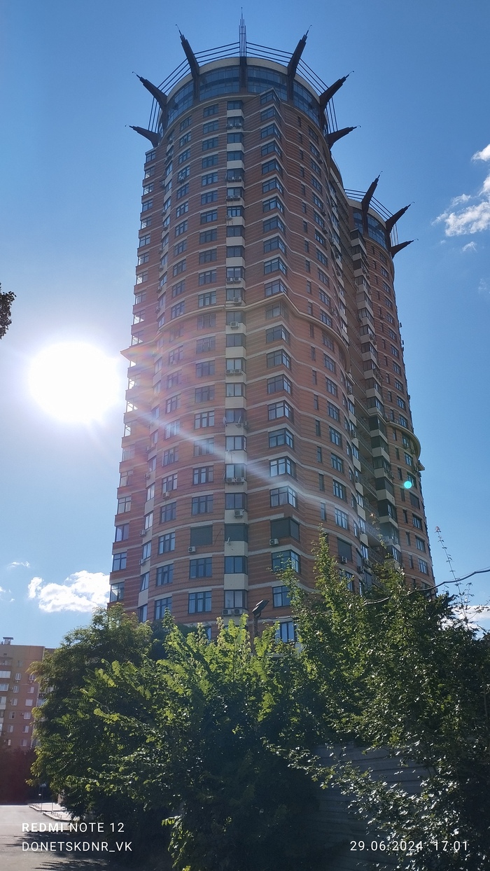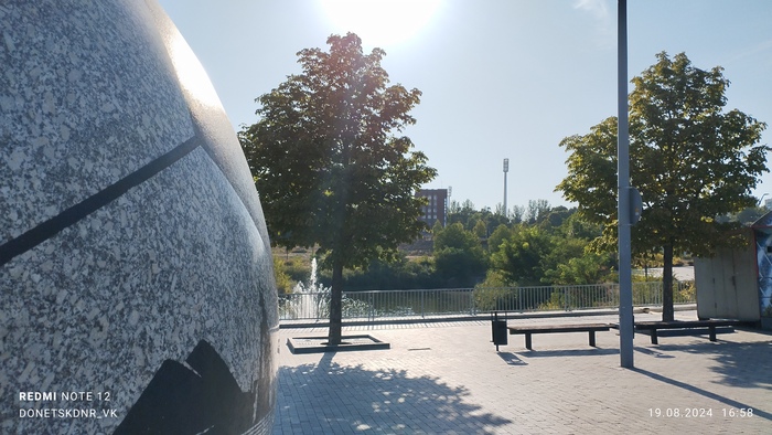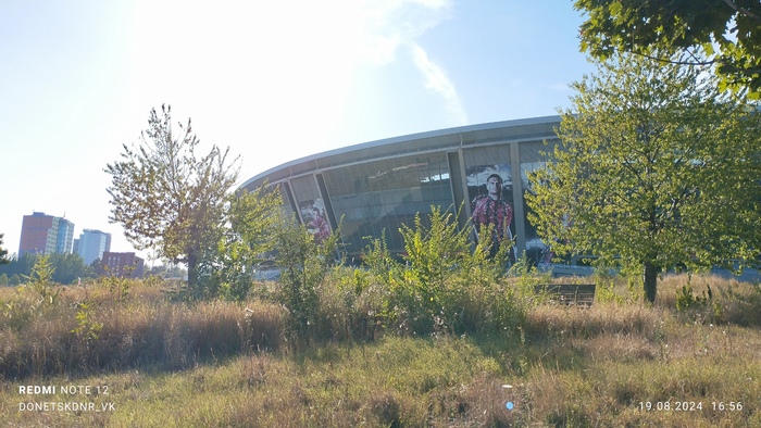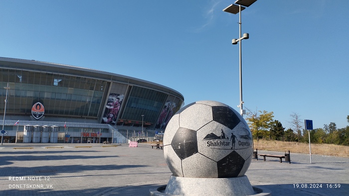 Что интересно, вокруг стадиона множество разрушений. Разрушен находящийся в непосредственной близости Дворец Молодёжи "Юность", в руинах Выставочный Центр " Декор Донбасс". Страшно всё это. Растения тоже пострадали. Дорогие деревья, высаженные вокруг, постепенно сохнут, газон стрижется лишь с одной "парадной стороны". Автополив не включается, мяч-фонтан стоит без воды, но хоть относительно цел. Всё это эхо войны, понятно, во время обстрелов не до газонов и декоров, но много где порядок поддерживается. Следы обстрелов кругом, кое-что сфотографировала, бегло проходя мимо. Удручающе... Особенно мне, кто помнит его во всей красе. Но уверена, война закончится, и я снова приду на матч на "Донбасс Арене". И деревья будут вокруг, берёзы, кстати, неприхотливы, и такие красивые!) И будет команда " Донецкий Шахтёр ", а " Шахтар" — они пусть сидят в своём Львові. Сами уехали. Их выбор.