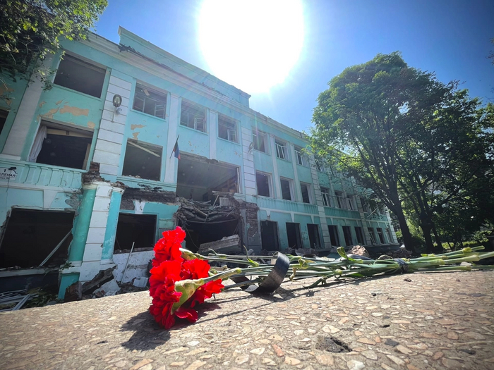 Директор гимназии Виктория Зайцева провела для нашей делегации экскурсию по гимназии. В каждом классе, библиотеке, читальном зале, холлах кипит школьная жизнь, а за окнами, буквально в 500 метрах, взорванные всушниками месяц назад здания...