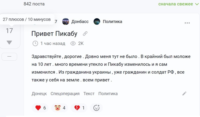 Здравствуйте , дорогие . Довно меня тут не было . В крайний был моложе на 10 лет . много времени утекло и Пикабу изменилось и я сам изменился . Из гражданина украины , уже гражданин и солдат РФ , все также у себя на земле . всем привет .