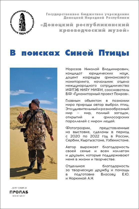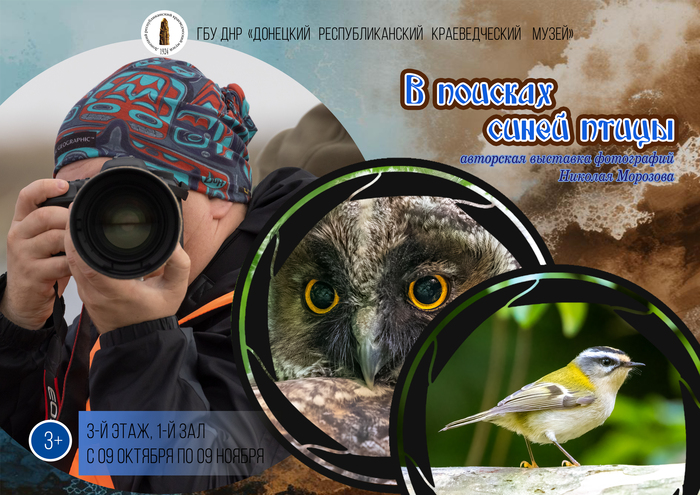 Если вы любитель природы и тем более птиц приходите в Донецкий республиканский краеведческий музей на фотовыставку Николая Морозова. В экспозиции можете увидеть детализированные фотоснимки птиц в широком формате. География фоторабот охватывает Среднюю полосу России и ее Южные регионы. Бонусом выставка будет дополнена чучелами птиц из коллекции музея.