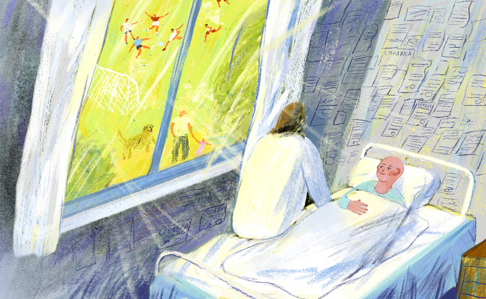«Человек — существо такое, что привыкает к любой ситуации. Даже к такой. Первый месяц было очень тяжело, мы не понимали, что происходит; было только каждодневное состояние паники. Когда нас выписали на две недели, после первого блока химиотерапии, стало полегче. Появилось чувство, что процесс движется. Осталось не пять блоков пройти, а четыре, потом три, два.