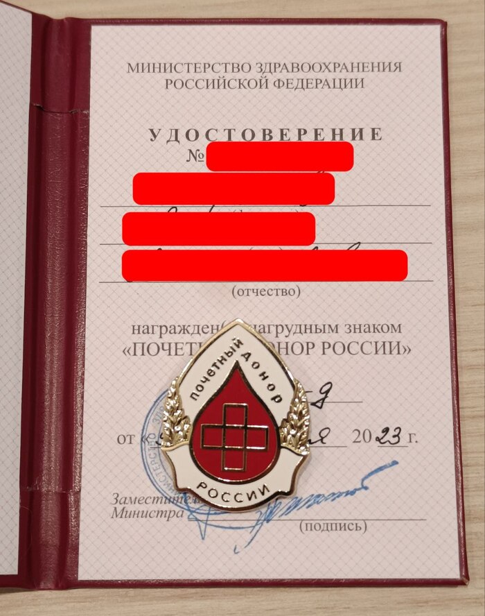 Теперь немного о звании почётного донора. Выдают его за 40 донаций цельной крови. Или 60 донаций плазмы. Или 40 смешанных донаций, если не менее 25 раз донор сдавал цельную кровь. Сдача тромбоцитов/эритроцитов/гранулоцитов приравнивается к сдаче цельной крови. Плюшек, полагающихся почётному донору, целая одна. Ежегодная выплата некоторой суммы денег. В 2023 году эта сумма составляет 16578 рублей, что подозрительно напоминает МРОТ. Все остальные "привилегии", как то право выбрать на работе удобную дату отпуска или стоять первым в очереди за путёвкой на санаторно-курортное лечение от работодателя, кроме кривой ухмылки ничего не вызывают. В столицах, подозреваю, всё несколько более радужно. После оформления приказа и получения корочек и значка на станции переливания донору (теперь уже почётному) предстоит путь в ближайший филиал ада на земле Территориального управления социальной защиты населения для постановки на учёт. Этот квест мне пока только предстоит, так что, если будет интересно, потом дополню пост.