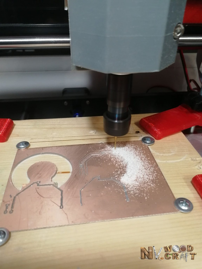 На гравировальном мини-станке CNC3018Pro произвел фрезеровку и выпиливание платы. Для фрезеровки использовал 2 фрезы: