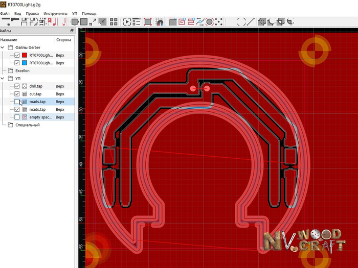 Для начала, макет сделал во Fusion360 чертеж платы, а позже перерисовал в KiCAD. Fusion360, оказалось не очень подходит для подготовки макета под фрезеровку. Gcode сформировал в - Gerber2Gcode: на выходе получилось 4 файла Gcode:
