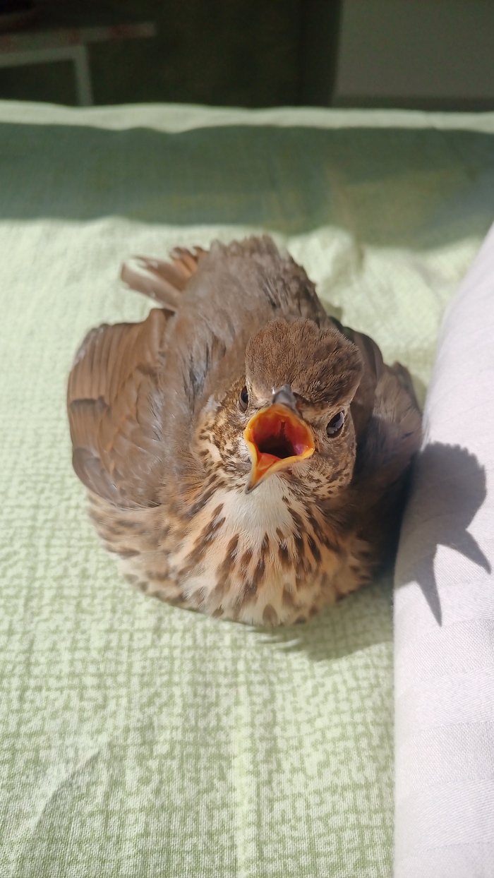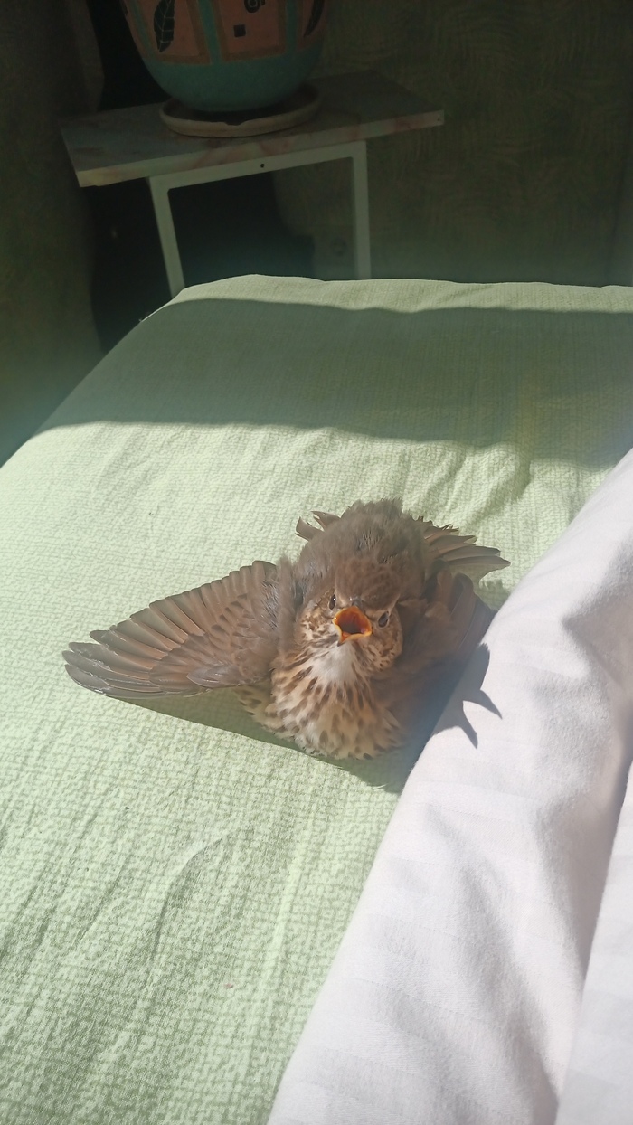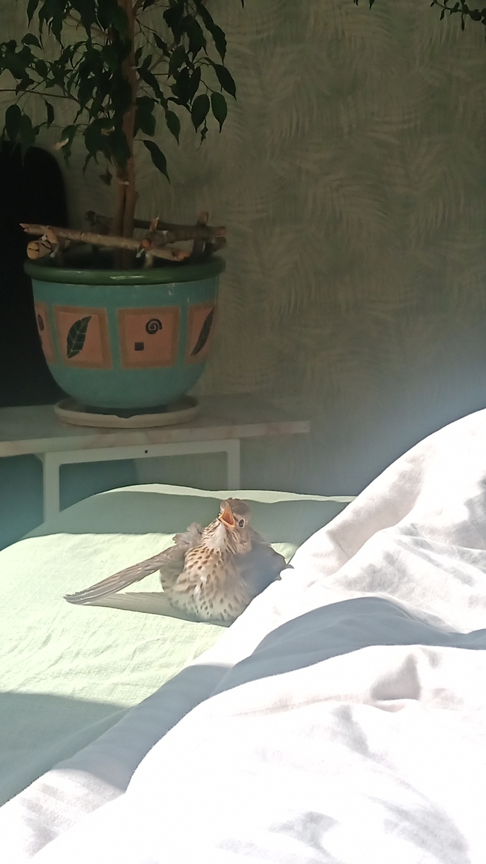 Дора загарает на солнышке. Через окно поверхность тёплая, вот и распушилась птица. Утро воскресенья.