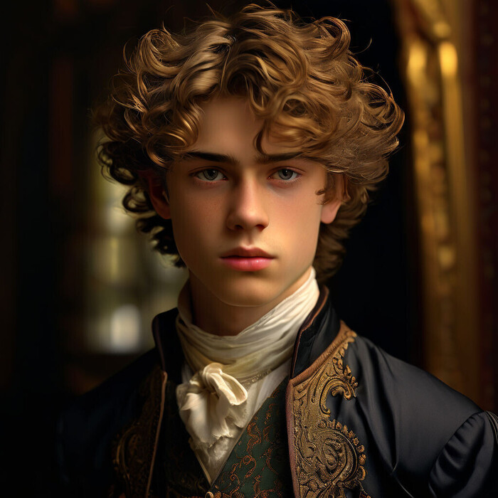 Итак, золотистые волосы, кудри (!) и лицо, вызывающее доверие с первого взгляда. Нежный юноша, почти ангелок с милой мордашкой. Поколдовав с нейросетями, мы получили вот такое изображение: