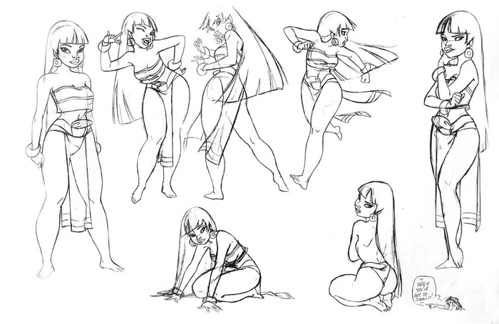 В интернете можно найти множество концепт-артов из «Дороги на Эльдорадо», на которых Чель изображена в хорошо знакомом нам образе: двухцветный топ и набедренная повязка. Однако, на некоторых артах Чель одета в пончо и... и, собственно, всё. Просто пончо на голое тело.