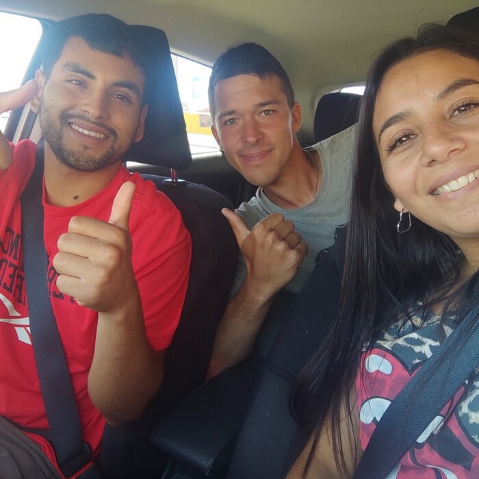 Машины безучастно проносятся мимо... Как вдруг кто-то сдаёт назад. За мной! Знакомлюсь с Лионелем и Карлой, они угощают меня бутылкой холодной воды.