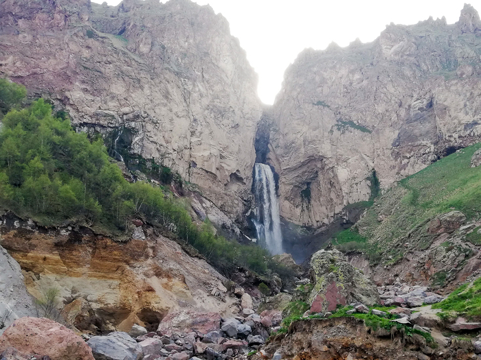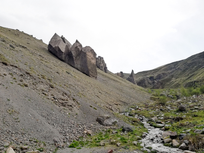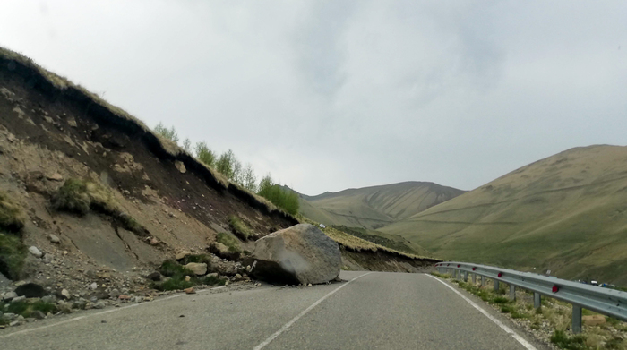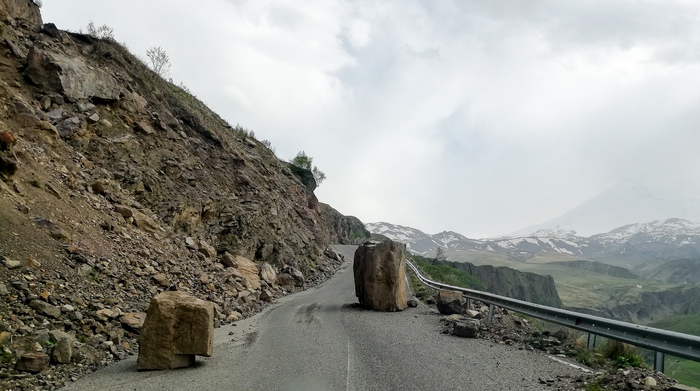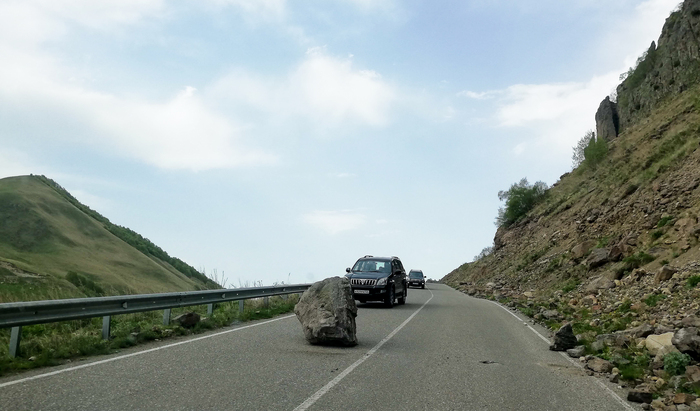 Дорога довольно длинная, но очень живописная. Ехал из Нальчика, довольно долго, примерно 6 часов, с небольшими перерывами. Сперва идут пейзажи типа "безмятежность". На последних участках на проезжей части лежали камни размером с машину. Камнепады здесь частое явление.