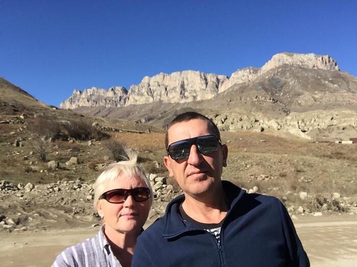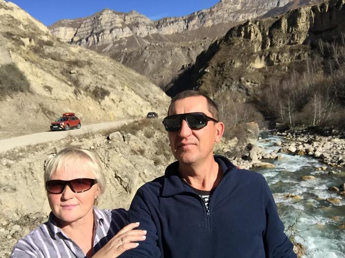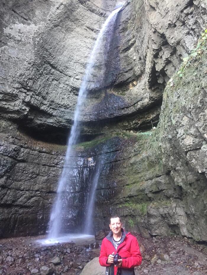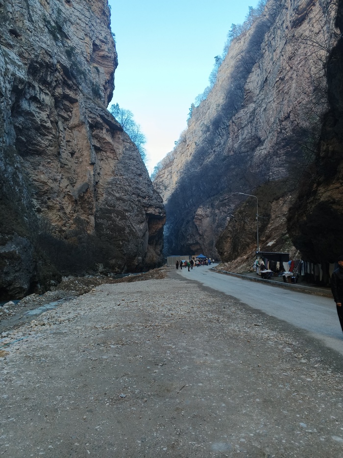 Позавтракав, тронулись на Чегемские водопады, которые рекомендовал Арслан, а мы хотели проехать мимо. Выезжая от реки на трассу, нам на мгновение, из тумана, показались Кавказские горы, их снежные шапки и тут же скрылись а тумане. Пока подъезжали к подножию горные вершины показались уже во всей красе, выглянуло солнце, туман рассеялся. При въезде в ущелье, нам открылся потрясающий вид,: с обеих сторон высоченные горы, голубая вода реки, множество самых разных водопадов. Словами и фотографиями не передать. Здесь же торгуют всякой национальной всячины: папахи, сувениры, изделия из шерсти и пуха, много видов сыров, каких не ëдывал, лет 20. Купили сулугуни трех сортов. Это тот вкус, который я искал 20 лет, который не купишь в магазине, его там просто нет. Поели шашлычка в кафешке, отметили так сказать вчерашние именины, да поехали дальше... Вверх по ущелью.
