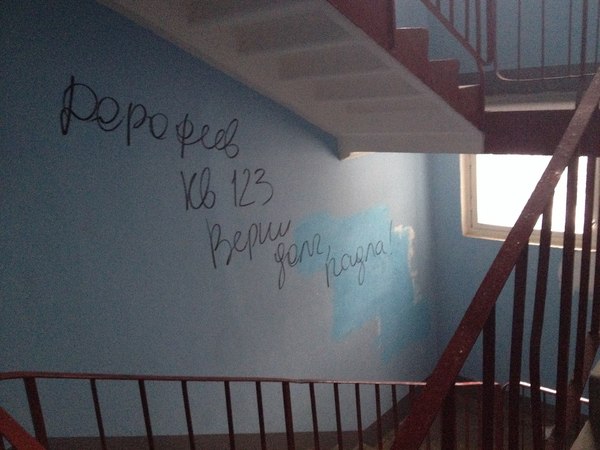 4 этажа. На каждом пролете.Кентервильские походу надписи, ибо их стирают на протяжении уже по-моему года. А они все появляются и появляются
