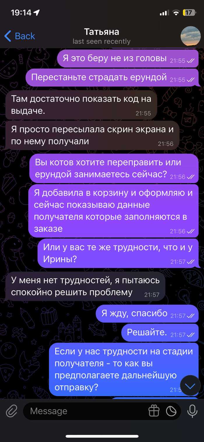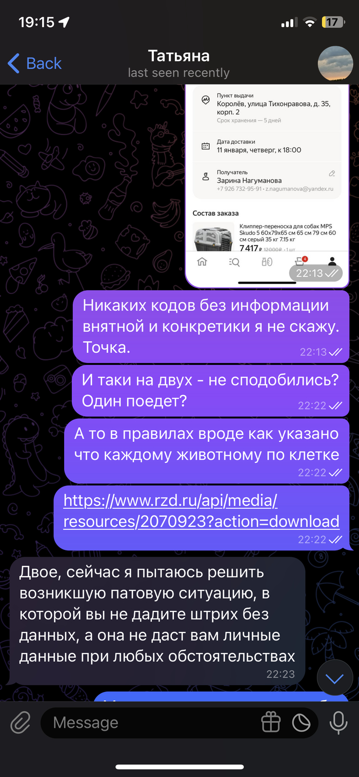 Началось «мятие сисек». Мол, были праздники и поезда не ездили. И отправить котов в праздники было никак нельзя, но вот сейчас - они дружно возьмут и все оформят! Что ты к нам прицепилась? ПЛОТИ ДАВАЙ.