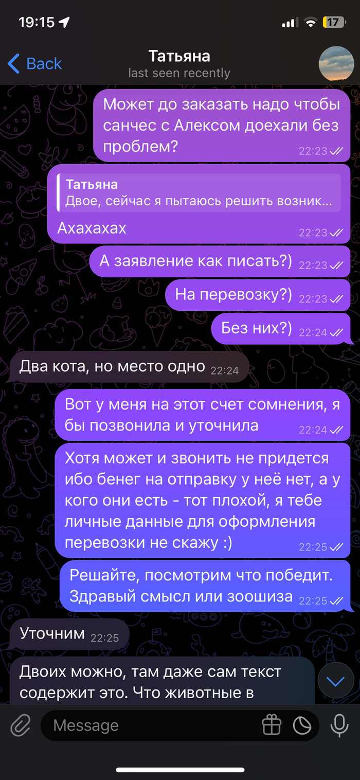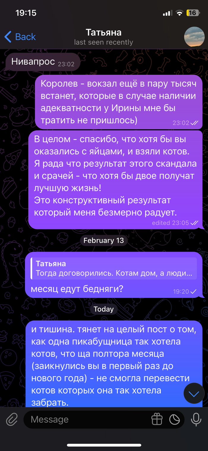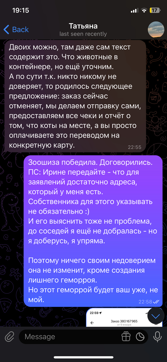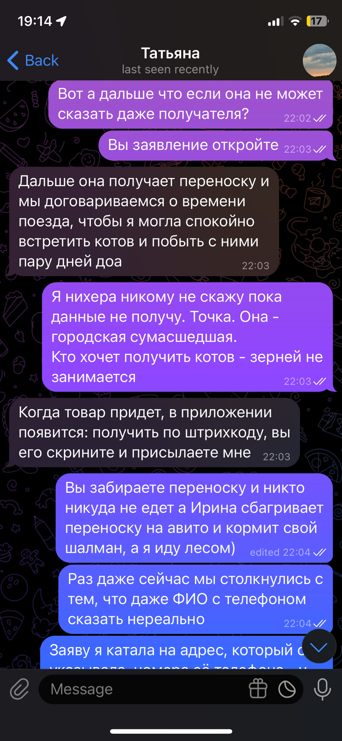 и в благородного волонтера @IrinaKosh, которая за полтора месяца не смогла организовать перевозку хвостатых и говорит, что это моя вина - потому что я ничего не оплатила.