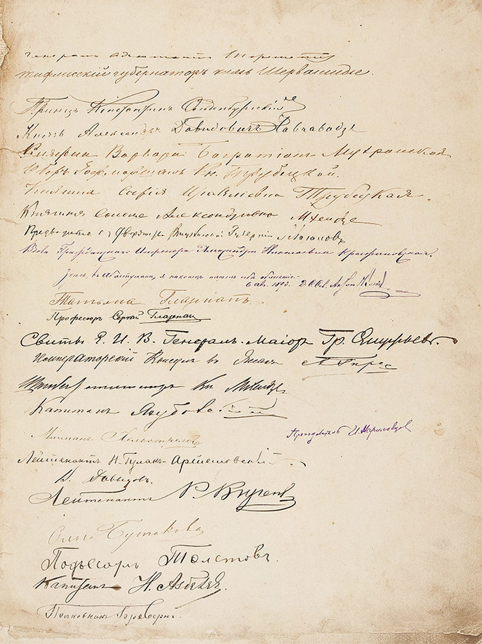 Кроме того, в книге присутствуют собственноручные подписи министра Императорского двора графа Иллариона Воронцова-Дашкова, генерал-адъютанта Сергея Шереметева, Тифлисского губернатора князя Георгия Шервашидзе, генерал-майора Алексея Олсуфьева и других.