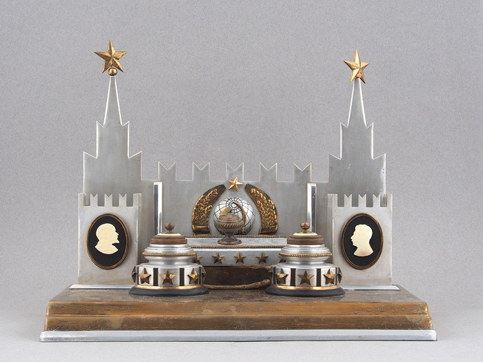 В подарочный набор входят две чернильницы, пресс-папье и две карандашницы, стилизованные под кремлевские башни со звездами и прикрепленными к ним барельефами с профилями вождей мирового пролетариата – Ленина и Сталина. Презент представляет коллекционную ценность и выставлен по стартовой ставке 450 000 рублей.