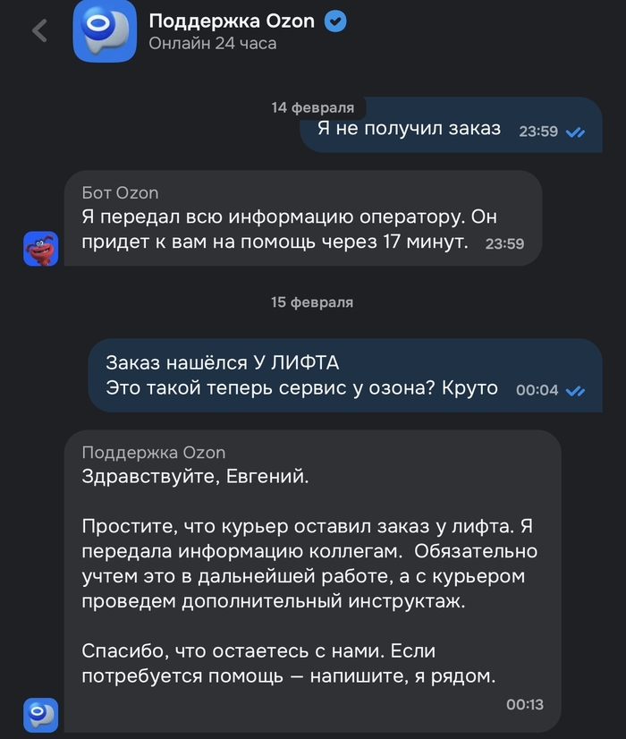 Озон фреш тоже косячит. Пробитые упаковки, в том числе готовой еды. Опоздания. Грязные пакеты. Теряют иногда какие-то товары или привозят чужое. Сегодня вышли на новый уровень доставки — доставка до этажа. В современном ЖК, как вы понимаете, лифт не рядом с квартирами, а в отдельном помещении с другими лифтами. И вот заказ был оставлен в этом помещении по непонятной причине. Курьер не пытался со мной связаться, он просто бросил продукты у лифта, поставил статус доставлено и ушёл. Я это не считаю даже доставленным. Это потерянный заказ, который я нашёл после того, как связался с курьером и он сказал что просто его оставил в общественном помещении. И что же говорит поддержка? Снова это бессмысленное корпоративное «простите». Никаких компенсаций за не в полной мере оказанную услугу, а значит сервис считает, что такой уровень — норма. 04367565-0427.