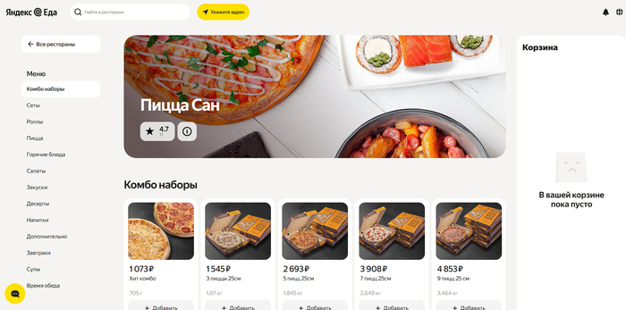 Разнообразие меню: пицца, суши/роллы/сеты, WOK-блюда, горячее, десерты, напитки — есть как для компаний, так и для одиночного ужина.