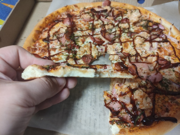 Выглядит весьма неплохо, тесто толщиной стандартной для ИмперииПиццы и PizzaSushiWok.