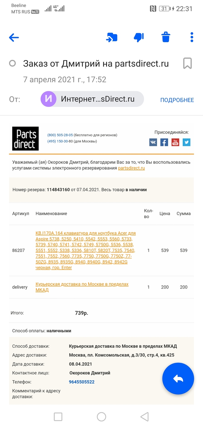 Ноут был проблемный. То одно вылезет, то другое. Вроде все победили и дело за малым. Согласовали напоследок замену аккумулятора. В PartsDirect есть, но последний. Согласовали с клиентом сроки в 1-3 дня.