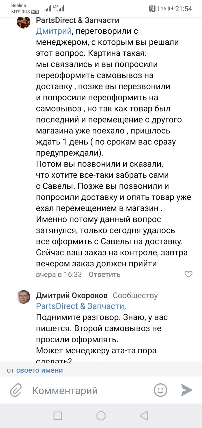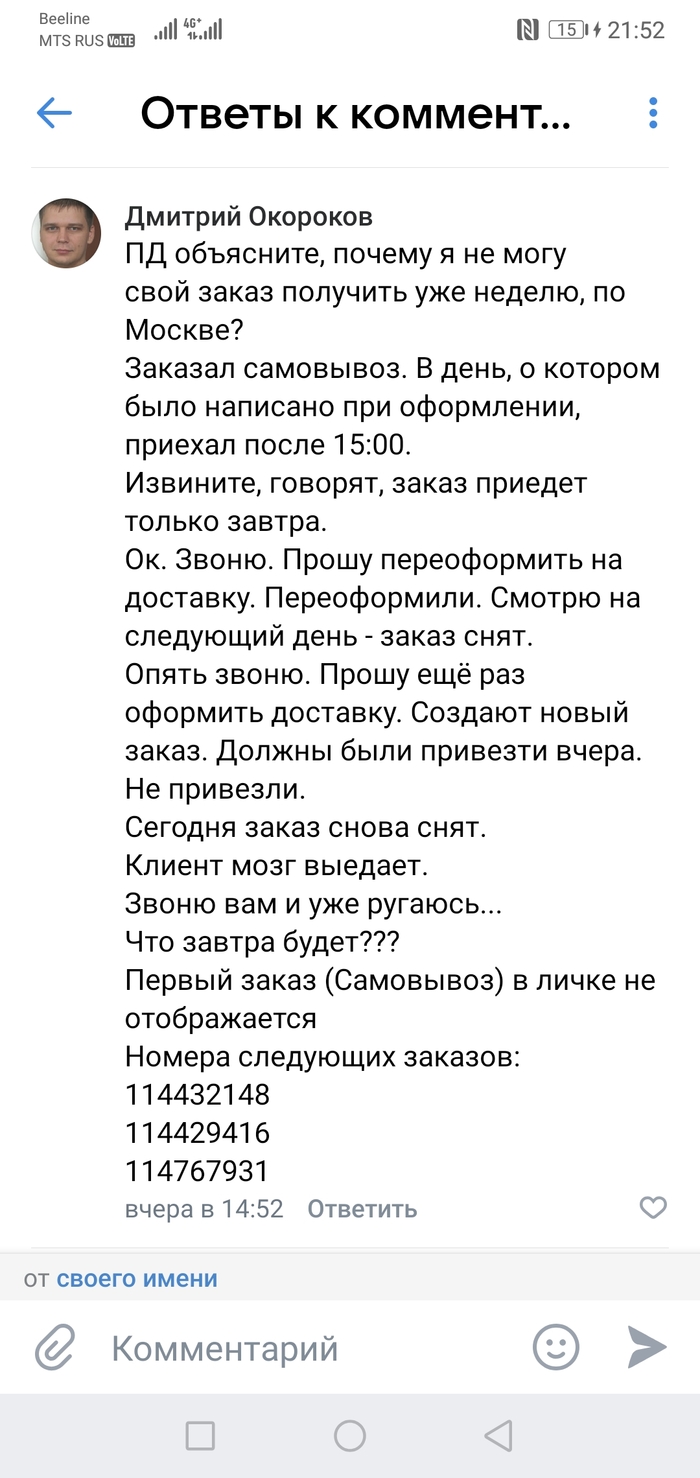 - 31.03 приезжаю в магазин за заказом после 15:00. Мне сообщают: извините, сегодня не приедет. Наверно будет завтра, после 15:00. Ладно, думаю, всяко бываить. Прошу переоформить на доставку, так как кататься времени нет. В магазине это не получается сделать - звоню в поддержку. Повторяю просьбу. Мне сообщают, что сначала заказ должен приехать в этот магазин, а уже потом я смогу его отменить и снова оформить на доставку.