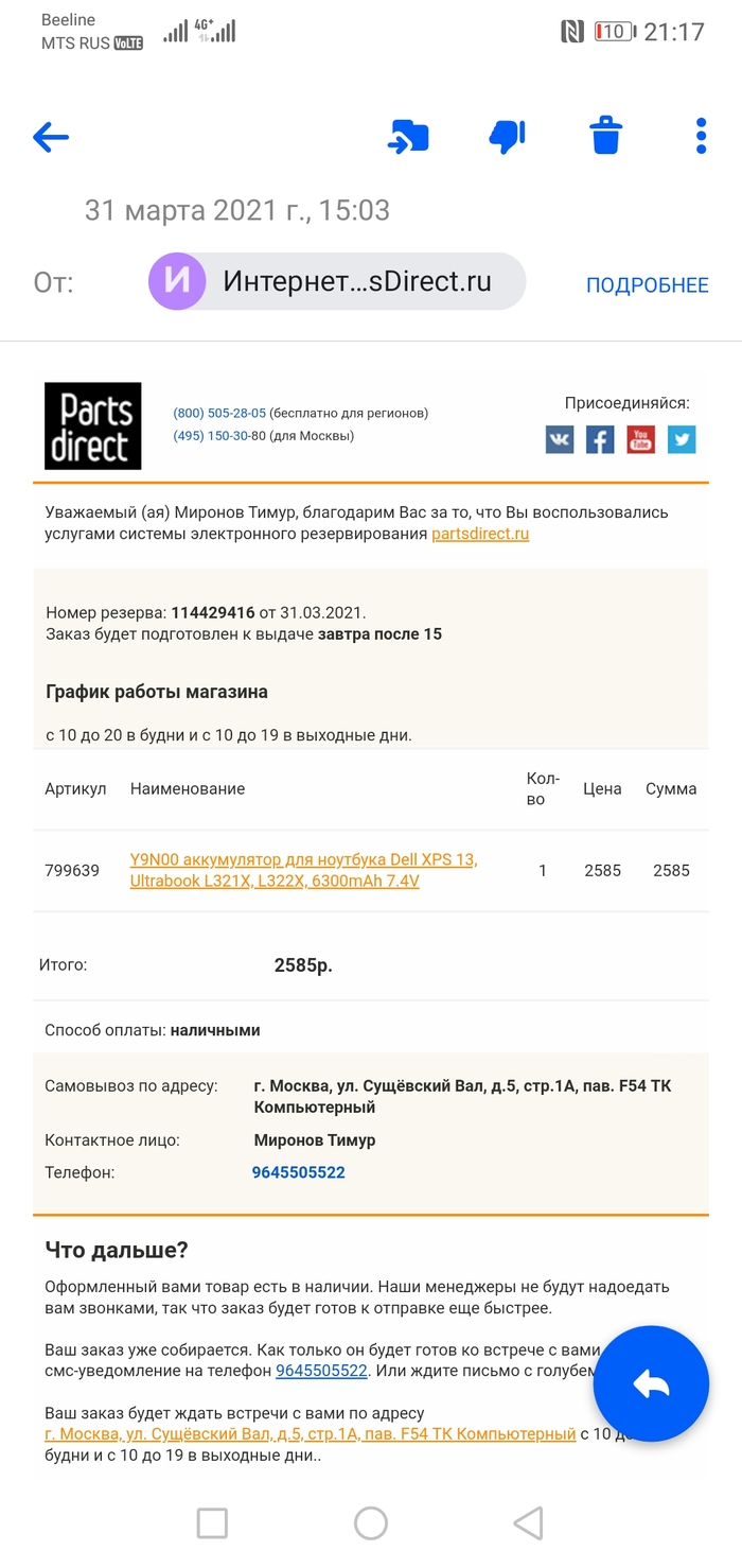 Прилетает мне письмо, что мой заказ будет готов к выдаче Завтра, после 15:00.