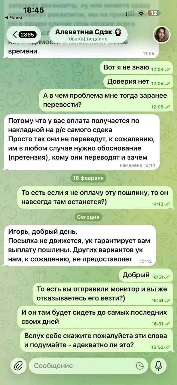 Прикрепляю скрины переписки Сдэк с отправителем (продавцом монитора), который не желает платить за пошлину из-за отсутствия гарантий.