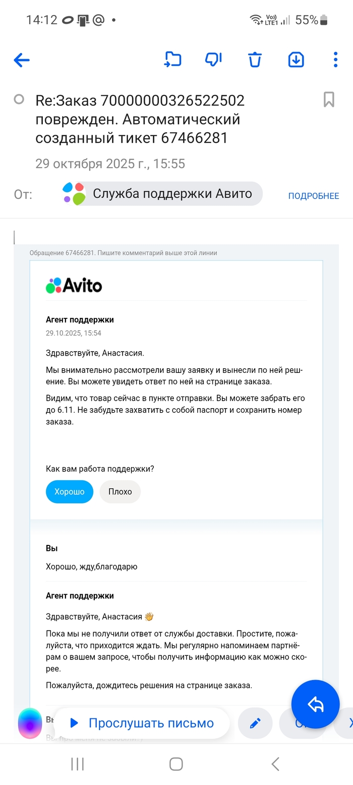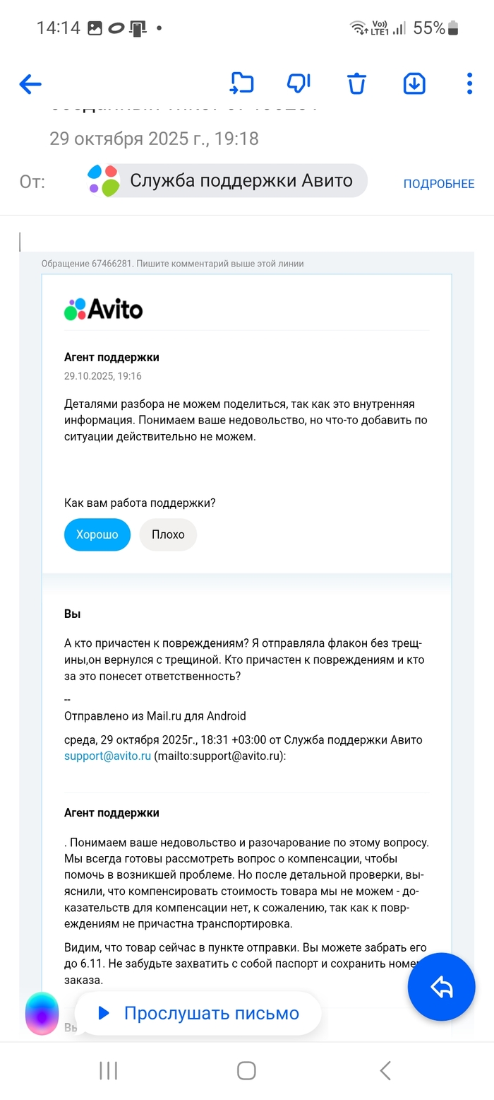Оператор сказала, что можно составить акт и сделать заявление в приложении, я так и сделала, прислала фото, потом запросили дополнительные и как итог, я получила отказ, тк авито не выявили нарушений в доставке. Нарушений выходит нет, а крышка треснутая есть, вот такие дела. Упаковывал сотрудник яндекс, я просто принесла товар. По итогу упаковка оставляет желать лучшего, а говорили в коробку и пупырку положат и надежно упакуют, но не случилось этого, впервые такое. Доставкой пользуюсь активно, как покупаю, так и продаю, но теперь поняла, что ни о какой безопасной сделке для продавца и речи идти не может. Почитала много тоже подобных случаев, но авито не находит нарушений и отказывает в возмещении. @Avito.help, так кто виноват по факту и что с этим делать. Я принесла целый флакон, получать обратно должна треснутый. Категорически не согласна с данным решением и требую пересмотра! Обращение 67466281