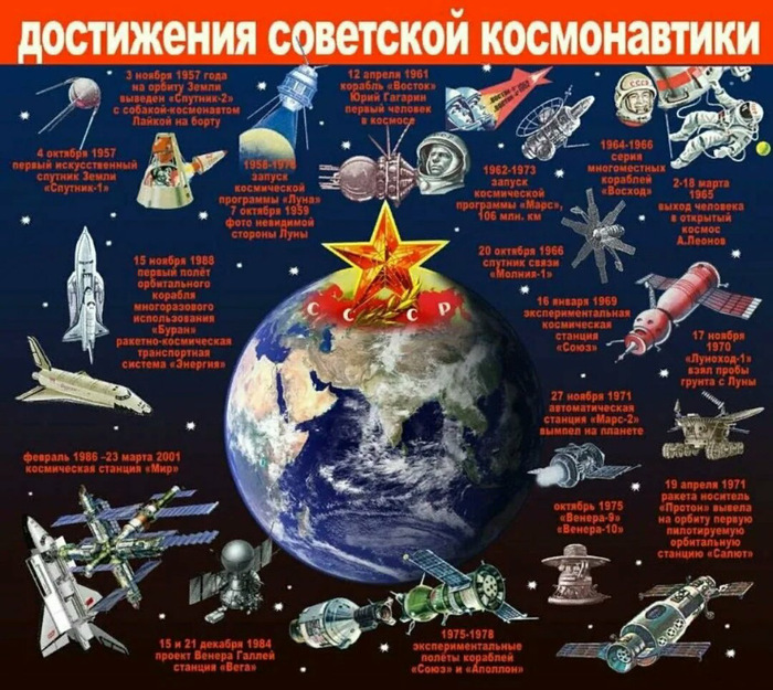 6) Достижения страны. Тут все очевидно. Великие стройки (ГОЭЛРО, Днепрогэс, БАМ, освоение космоса (первый спутник, посадка и первые фото с Венеры, первый человек в космосе), Победа над фашизмом.