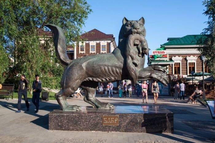 Иркутск – один из городов, где сюжет, изображенный на гербе, является уникальным. Произошло это потому, что бабра можно назвать мифологическим животным или, скорее, собирательным образом сразу нескольких больших кошек – пантера, леопард и даже тигр.