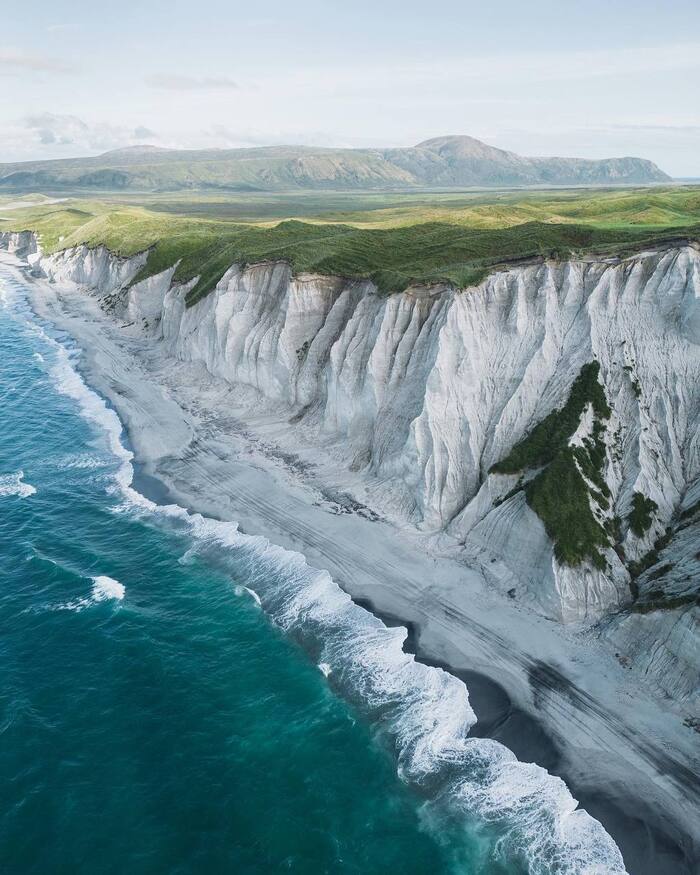 Одно из самых фотогеничных и узнаваемых мест на Курильских островах - Белые скалы. Они поражают своей резной формой и эффектно выглядят на контрасте с черным вулканическим песком пляжа, раскинувшегося у их подножия.