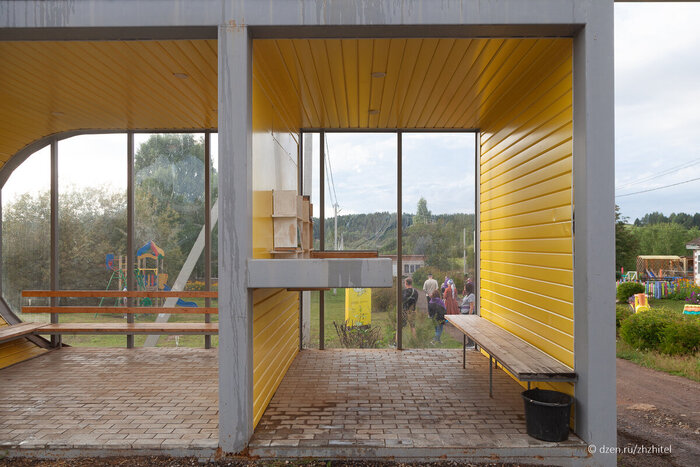 Остановка разделена на несколько зон. В букве «С» — скамейки, поставленные углом. Там можно собраться вместе и поболтать. В букве «Е» скамейка одна, там можно уединиться или посидеть в тесной компании. Панорамные окна дают много света и защищают от непогоды.