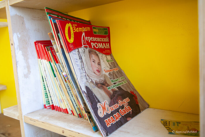 За перекладиной буквы «Е» на стене расположены полки. Тут собрали деревенскую уличную библиотеку. Можно что-нибудь почитать в ожидании транспорта.