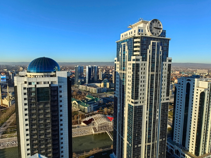 На берегу реки Сунжа возвышаются семь зданий-«свечек» комплекса «Грозный-сити», включающего гостиницу, офисы и 40-этажный жилой корпус. Со смотровой площадки на крыше одного из небоскрёбов открывается круговая панорама на город. Здесь можно сделать эффектные фото на фоне часов, установленных под крышей соседней высотки.