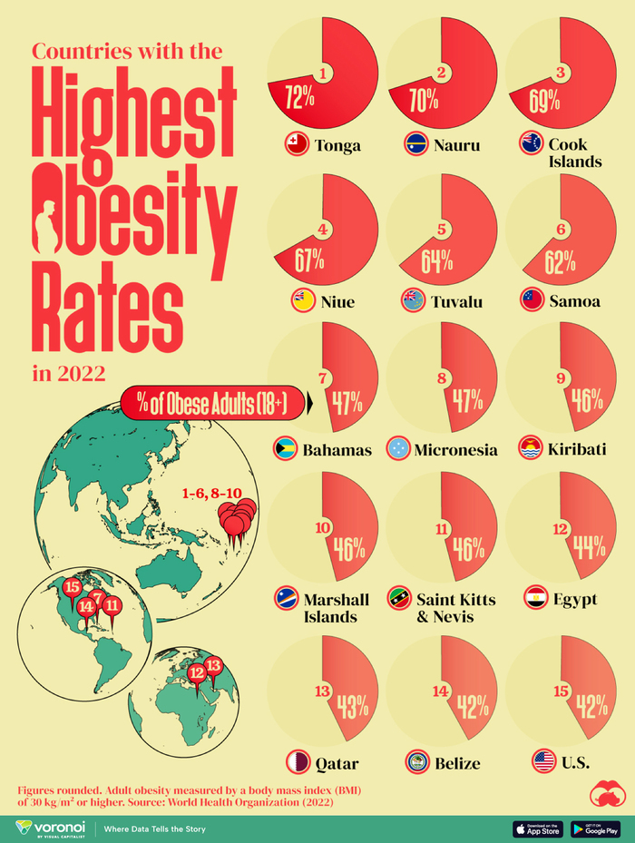 Из неожиданного: Катар на 13 месте в мире по уровню ожирения среди взрослых: 43%, что даже выше чем в США (42%). Даже высокие налоги на вредные продукты, газировку, фаст фуд и табак не помогают.