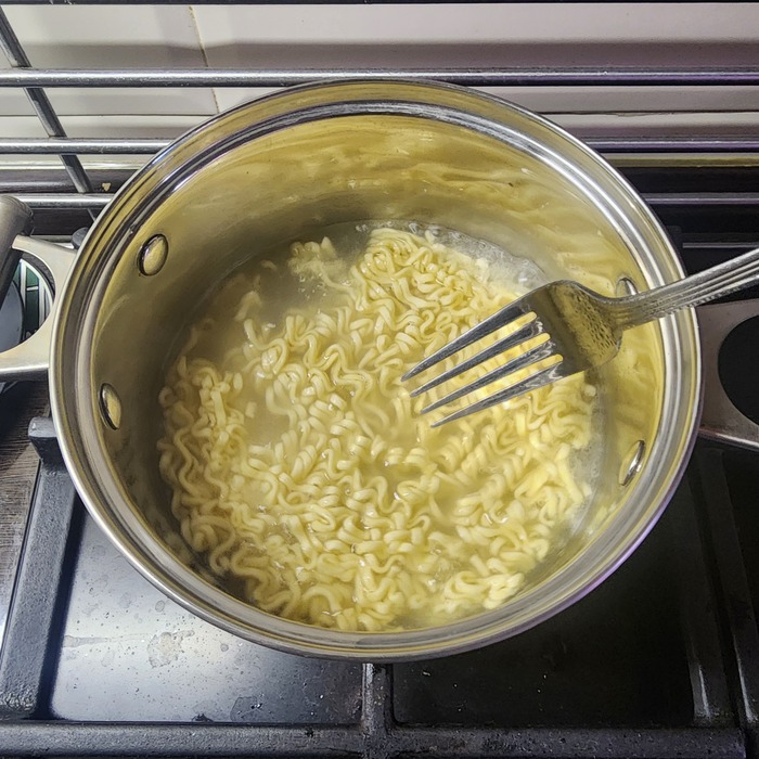 Вода в ковшике закипела, выкидываем туда все пакетики КРОМЕ УКСУСА, и саму лапшу. С лапшой нужно быть осторожнее, она тонкая и хрупкая.