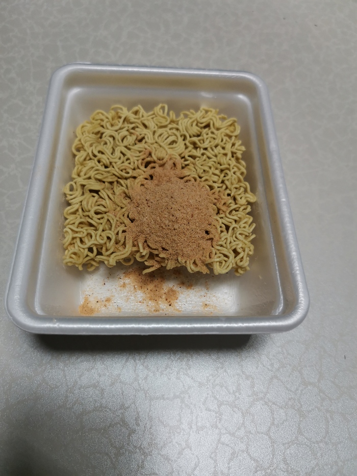 Набор лапши не сильно обрадовал. Как видно в комплекте только лапша и пакетик с соусом. Сама лапша по запаху тоже пропитана как им то маслом. Пакетик при пальпировании не обнаружил в себе каких либо твердых частиц.