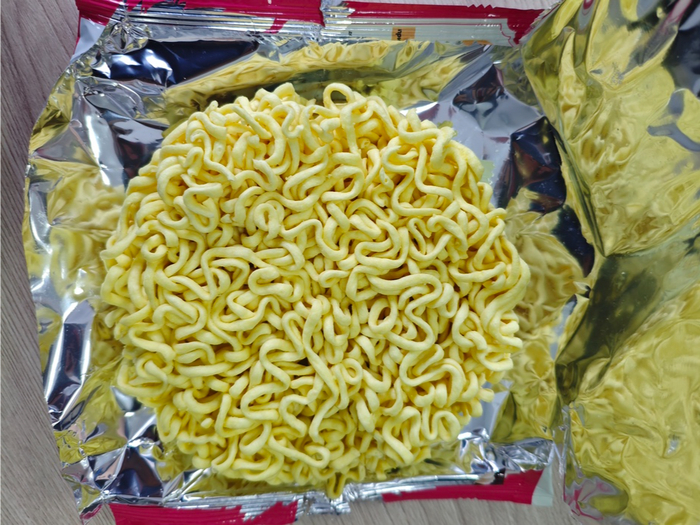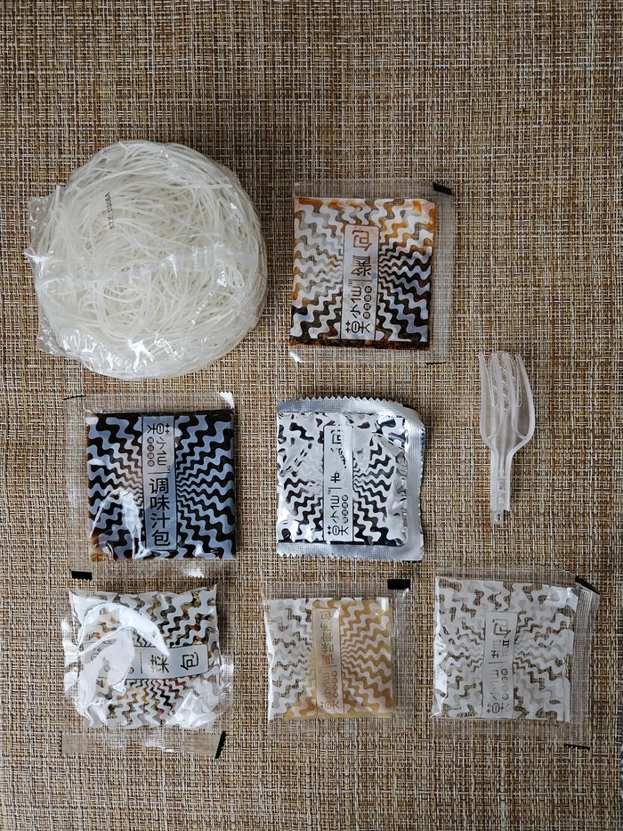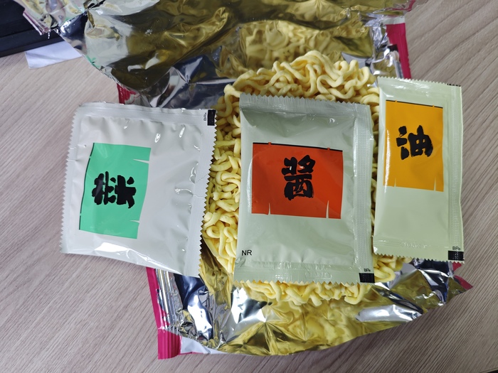 Так как мы уже знаем о том, что нас ждёт внутри вскрывать не так интересно. Но тем не менее 6 пакетов с добавками, пластиковая вилка и сама лапша.
