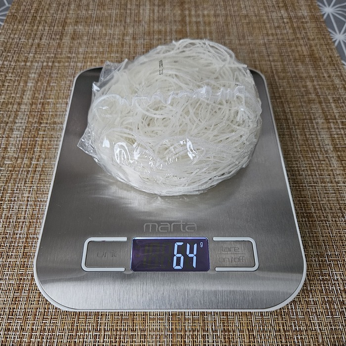 Поехали по порядку. Рисовая лапша. Тонкая, бесцветная, без запаха. Масса 64 грамма.