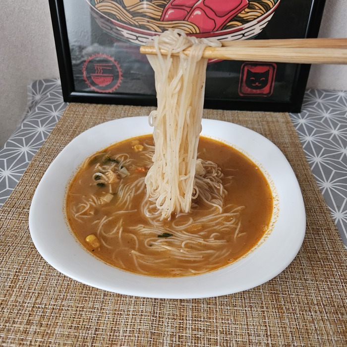 Рисовая лапша со свиным бульоном и овощами