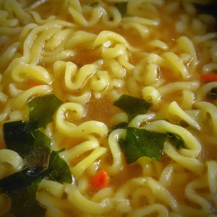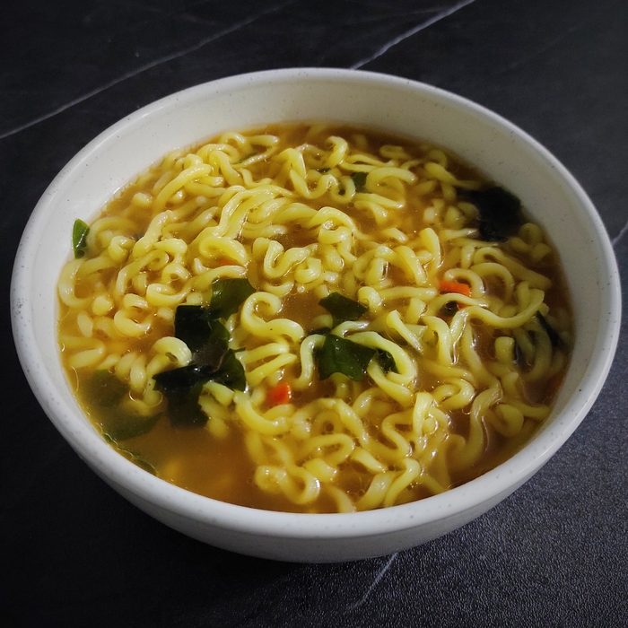 Порция среднего размера. Бульон красивый, мутно-рыжий. В запахе отчётливо выделяется красный перец и где-то очень далеко зира. По вкусу кисло-острый. Кислота значительная, острота тоже на уровне. Примерно около трёх островатт. В послевкусии ощущаются и мясной вкус и чеснок, но скромно. Хотелось бы их большего участия во вкусе блюда. Лапша понравилась. Тонкая, но не разварившаяся, не скользкая. Хватается и естся удобно. Зелень хрустит. Морковь и кукуруза придают сладости. Юба вкусна, но хотелось бы побольше.