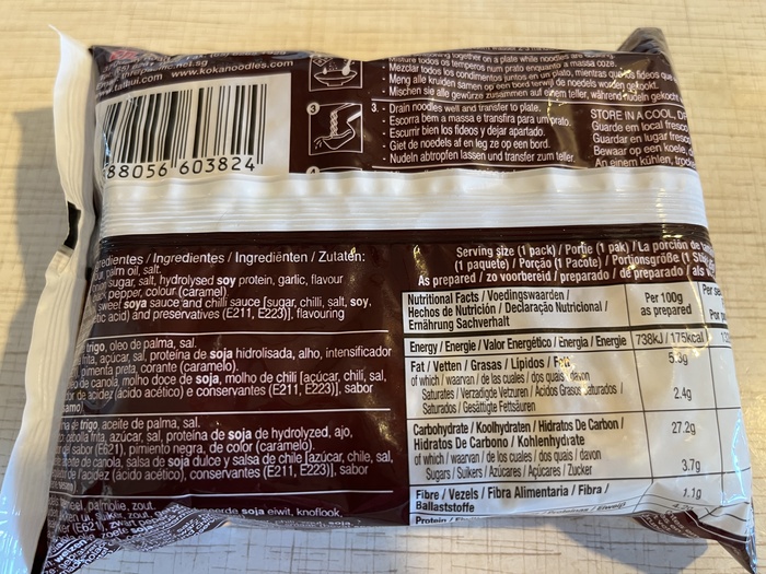 С обратной стороны традиционная пачка информации на английском, арабском и индонезийском языках, китайского здесь нет. Есть наклейка от поставщика с переводом на русский, но она настолько крошечная, что я практически ничего не смог разобрать. Впрочем, английский текст даёт понять, что лапша сделана в основном из пальмового масла с добавлением множества химикатов. Ну а чего вы хотели за 40 рублей.