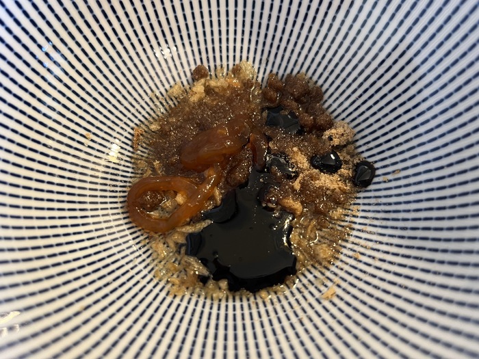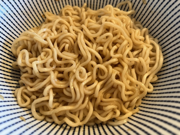 Что внутри. Внутри всё как обычно. Кружок лапши, пакетик с соусом, пакетик с приправой. Овощных добавок нет. Общий вес - 84 грамма. Лапша бледненькая, приятно пахнет пальмовым маслом. Приправа же не имеет практически никакого аромата, равно как и соус. Это странно. Обычно в подобной продукции всё такое... пахучее, а тут вон какой финт ушами. Я было дело даже подумал, что в очередной раз подхватил коронавирус, но нет - это просто такая особенность продукта. Соуса кстати пожалели - его вот прям совсем капелька, что, впрочем, видно на фото.