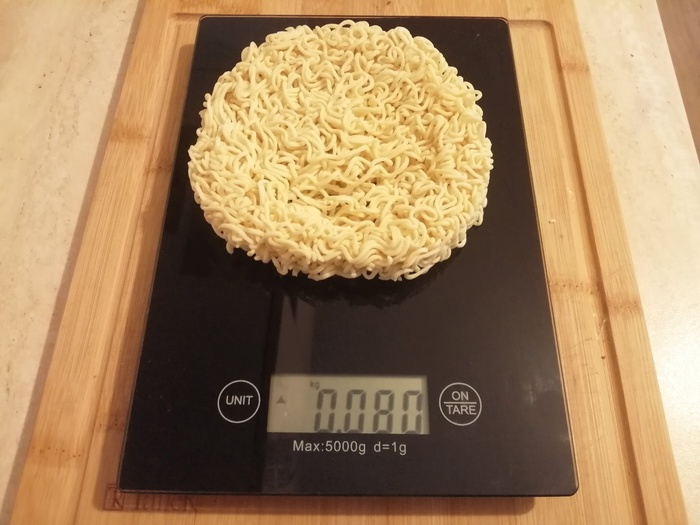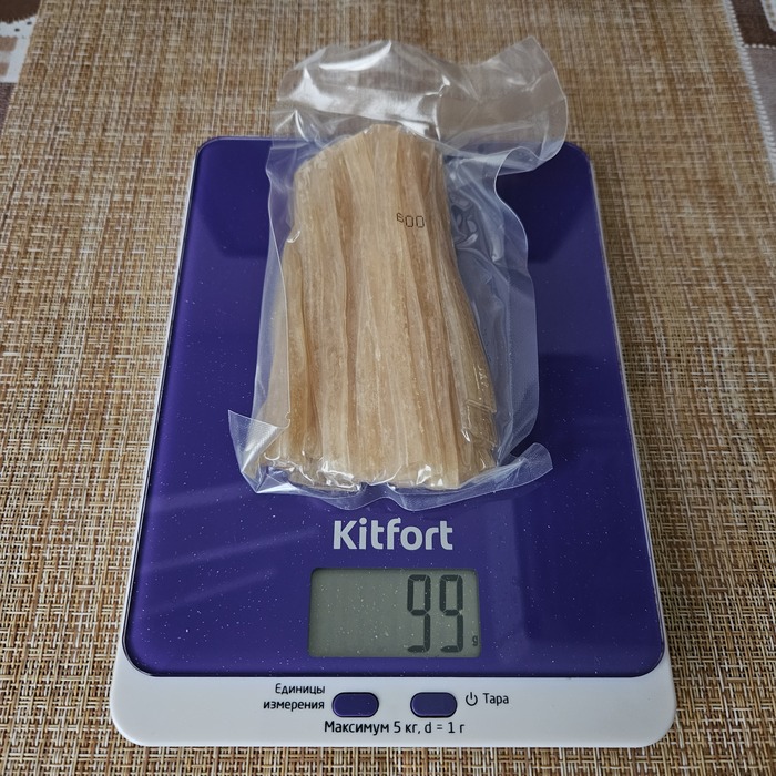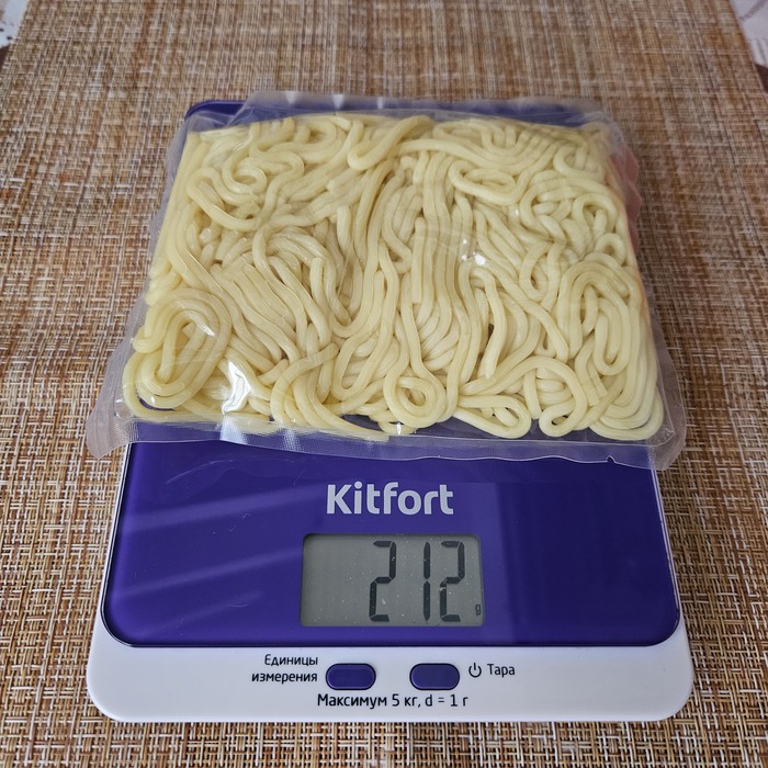 Пшеничная лапша уже готовая. Похожа на спагетти, но толще. Масса лапши около 210 граммов.