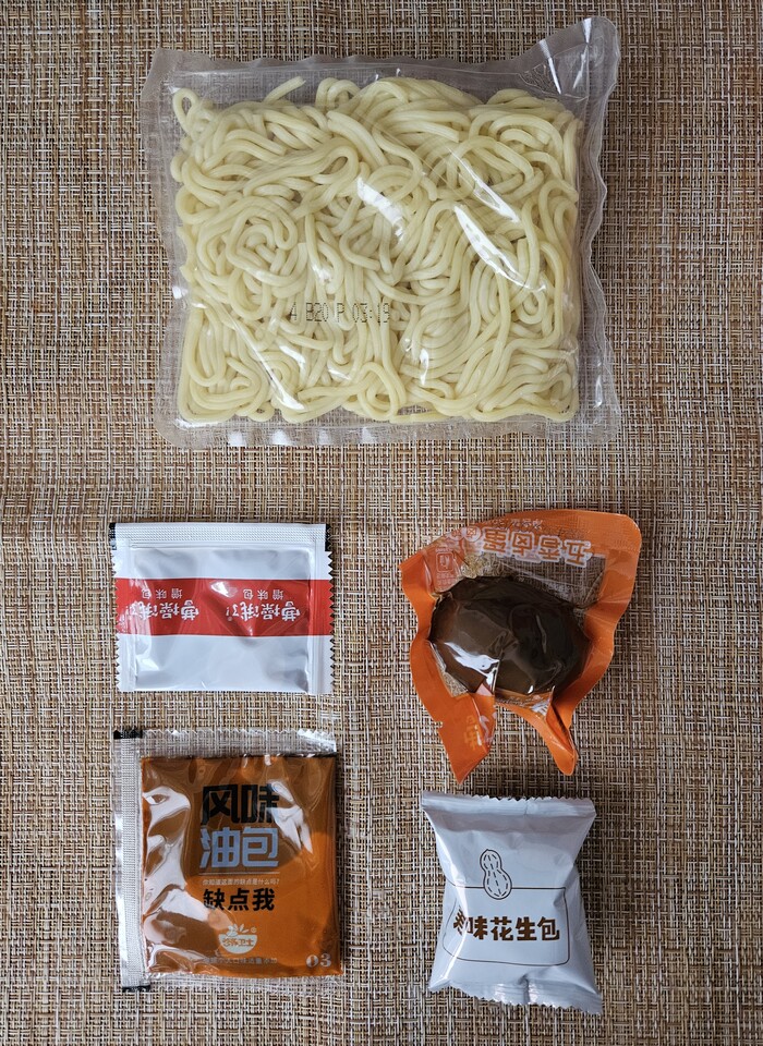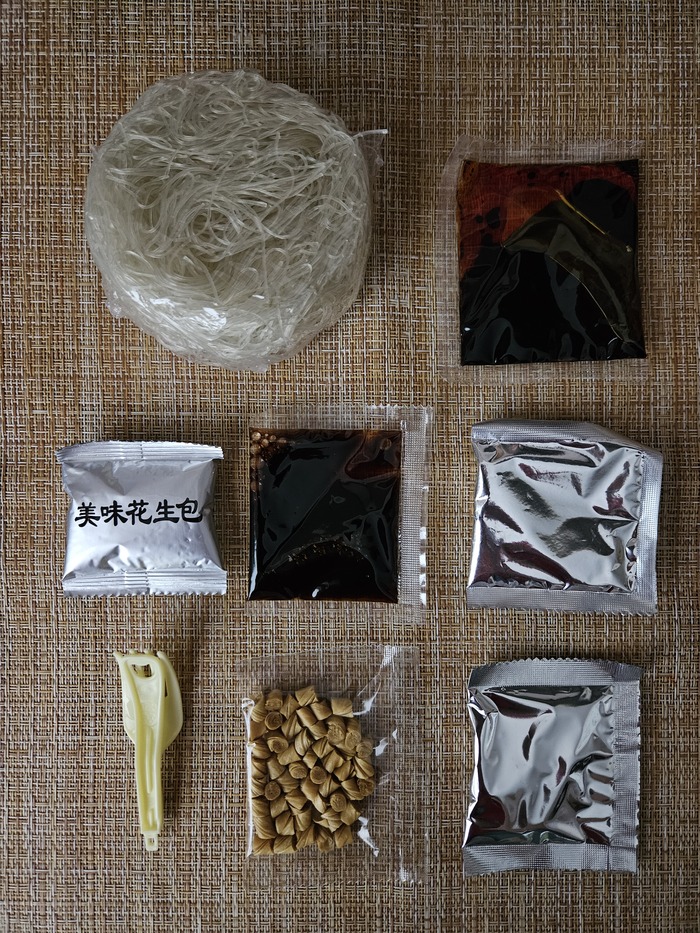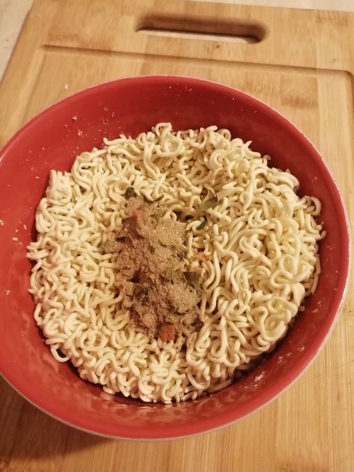 В съедобной, же части мы видим лапшу и четыре пакета с добавками.